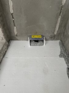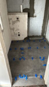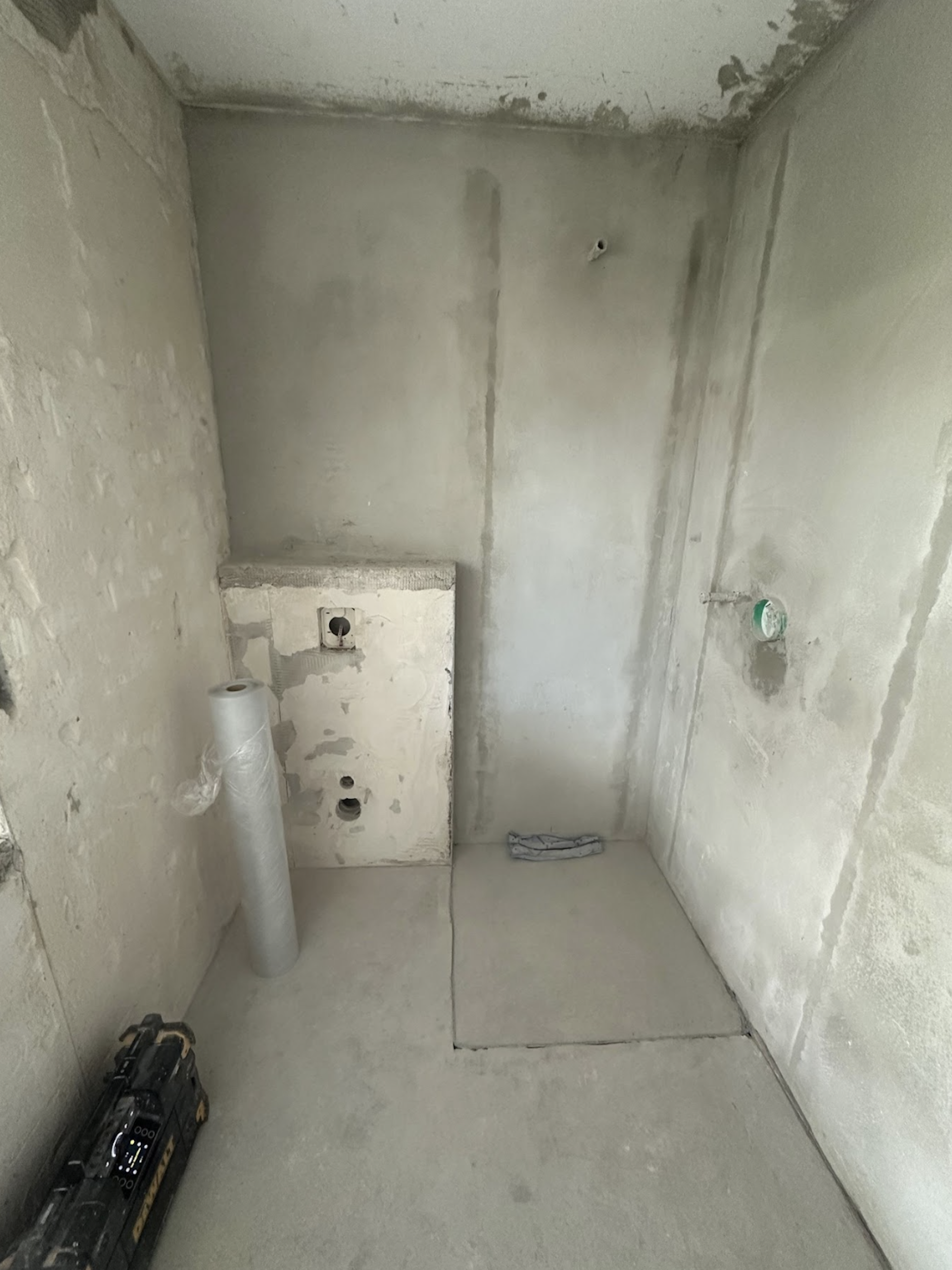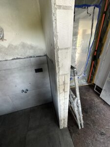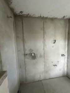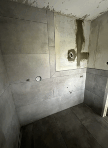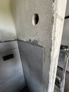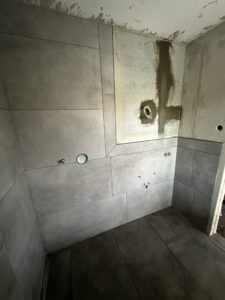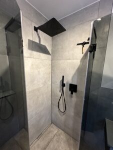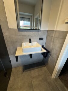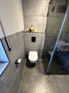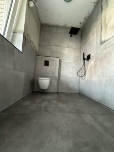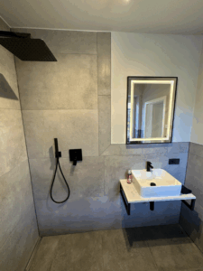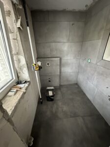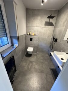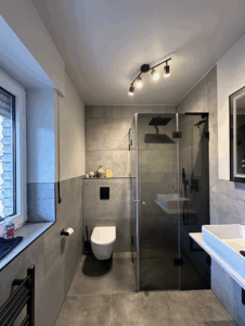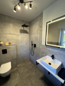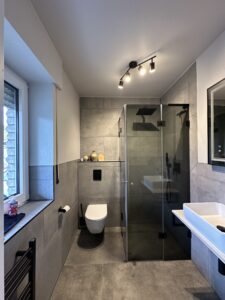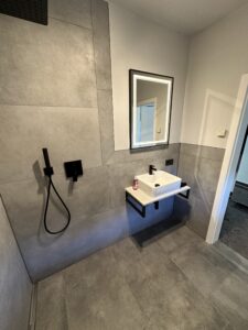Die alte Duschwanne wurde entfernt und durch einen Gefälleestrich ersetzt, sodass eine moderne, bodentiefe Dusche entstehen konnte. Die Wände erhielten neuen Putz, Abdichtung und Fliesen. Anschließend wurden alle Feininstallationen umgesetzt – von Lampen über Armaturen bis hin zu einem maßgefertigten Betonwaschbecken. Dieses Waschbecken wurde auf einer von uns selbst gegossenen Betonplatte montiert und so perfekt ins Gesamtkonzept integriert.